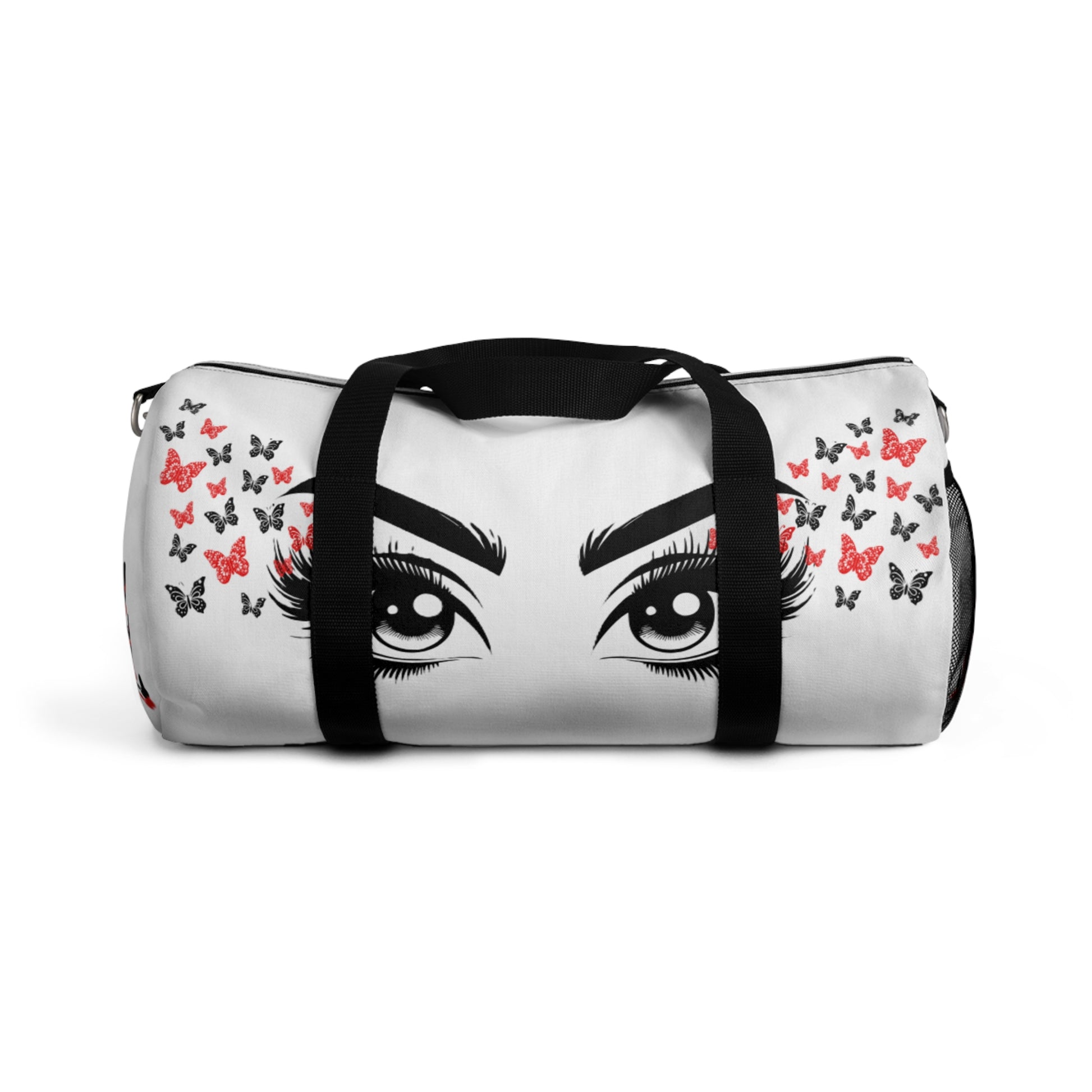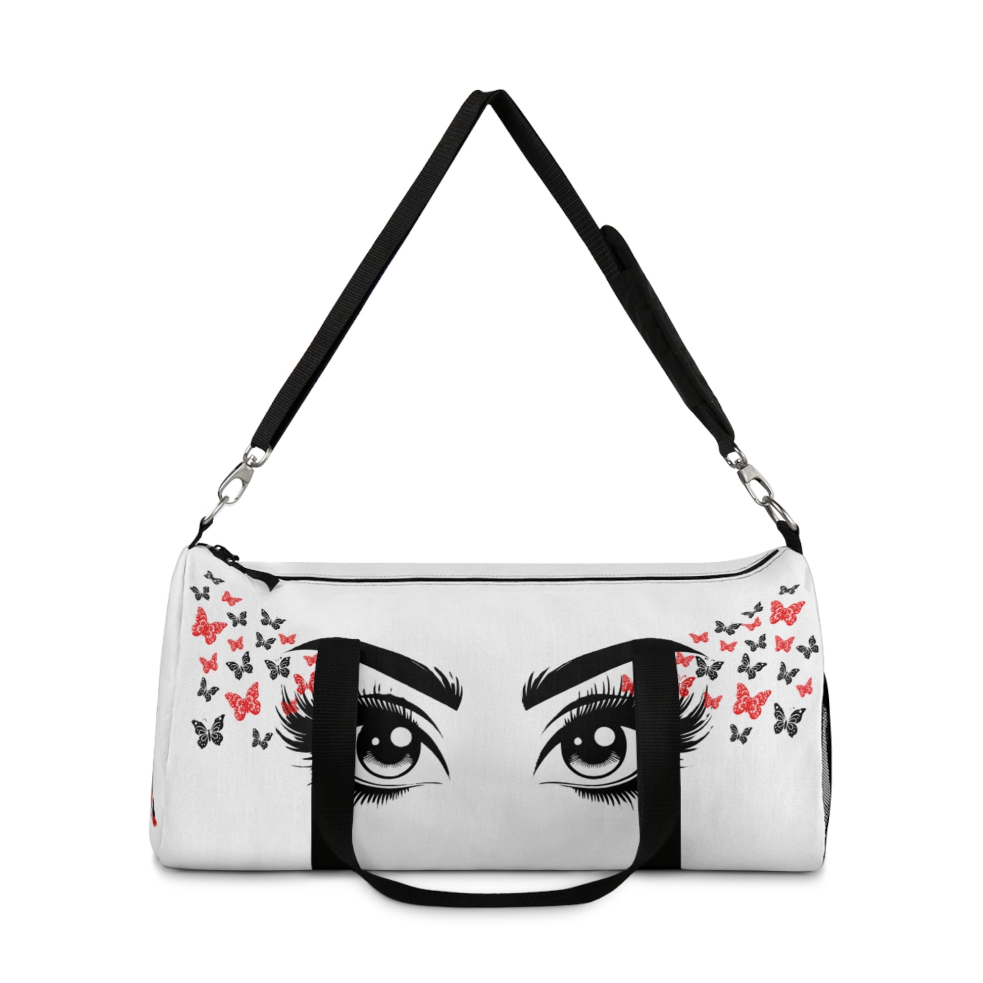 A stylish duffel bag featuring a design of a pair of eyes with butterflies coming off the outer corner, giving off a whimsical and dreamy vibe. Perfect for travelers, gym-goers, and students looking to add a unique touch to their accessories. Ideal for gifting on birthdays, holidays, and special occasions.