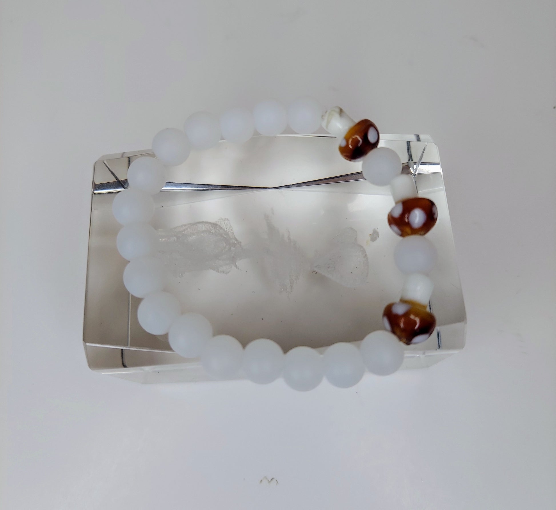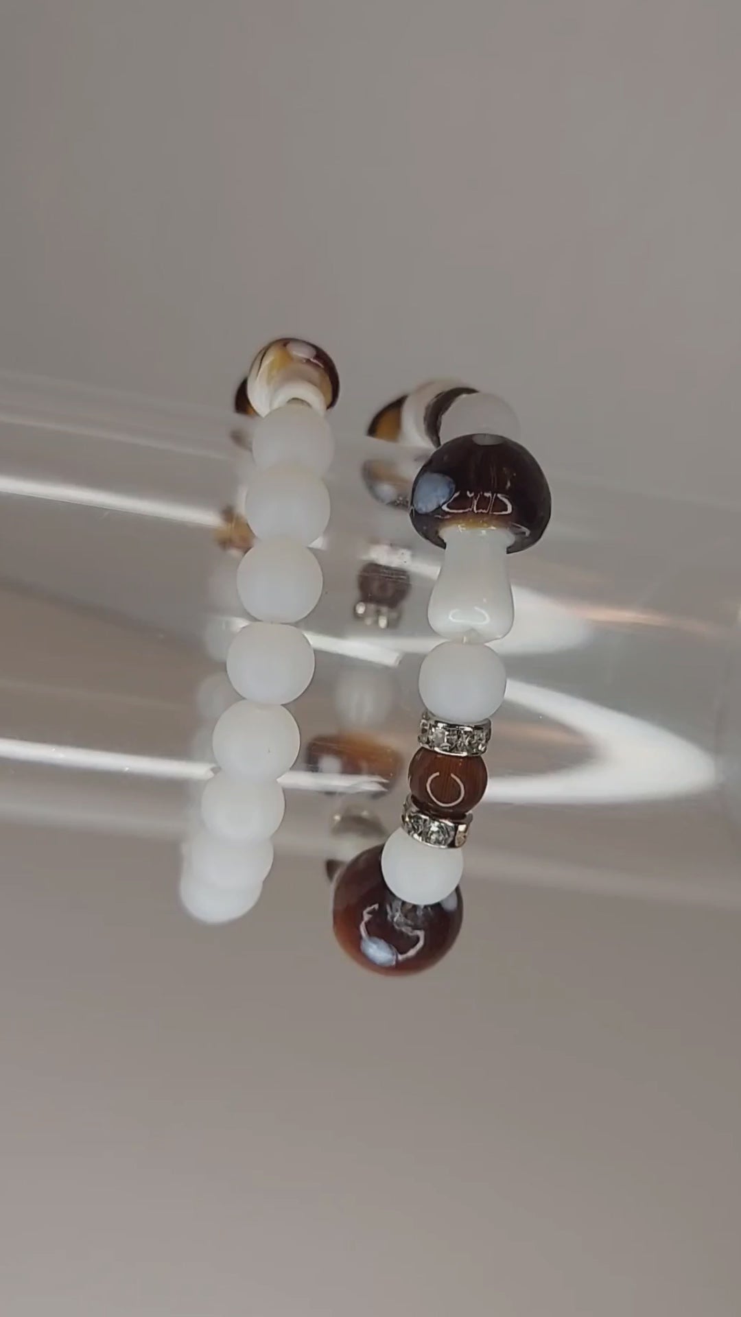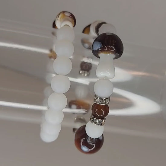 Glass mushroom beads accompanied by glass white beads. Perfect for mushroom lovers!!