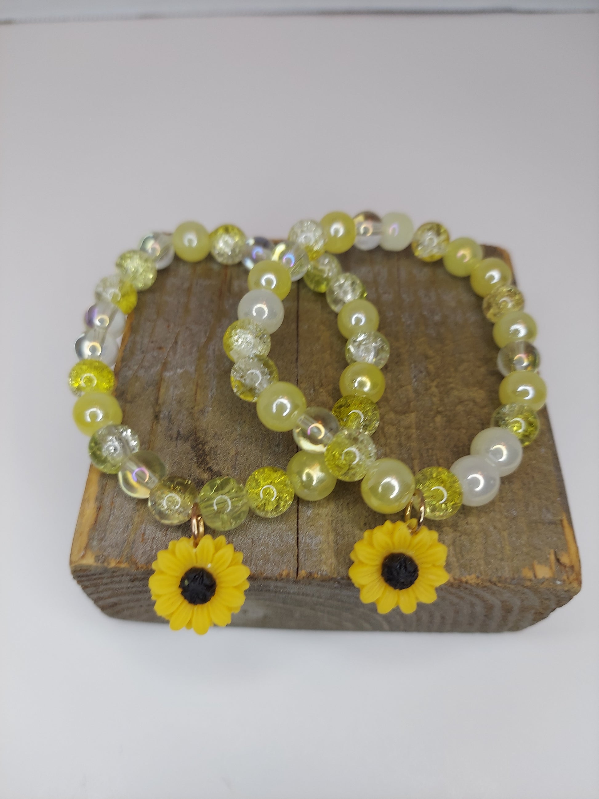 Yellow Ice Glass Beaded Bracelet with Small Sunflower Charm